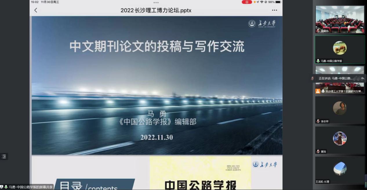 《中国公路学报》编辑部主任马勇教授以主题《中文期刊论文的投稿与写作交流》作报告,介绍了《中国公路学报》期刊,并且分享了中文期刊投稿经验体会。通过《中国公路学报》期刊的部分获奖情况、项目资助、近十年来的影响因子信息、收稿和发文量、发表周期、高产高校、专题出版、汽车工程论文的影响力、未来刊发方向、“智能新能源汽车与设计”专刊、青年编委、数字化建设以及视频号展示等多个方面向我们介绍了《中国公路学报》期刊的影响力、发展方向等。马勇分享了中文期刊投稿三点经验体会:一、用心+体会,了解期刊,研究投稿,用心撰写;二、认真+坚持,不急于写作,不要讨厌修改,要把一篇文章改写十遍、二十遍;三、学术礼仪,对编辑部的礼仪以及对待审稿专家的礼仪。