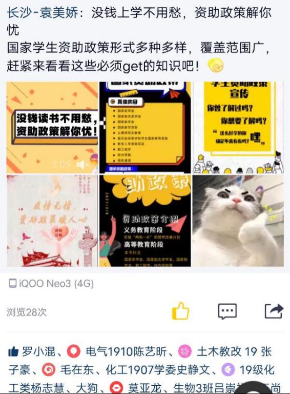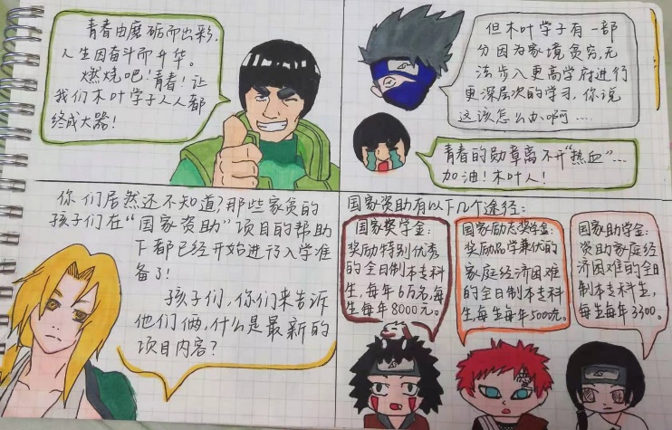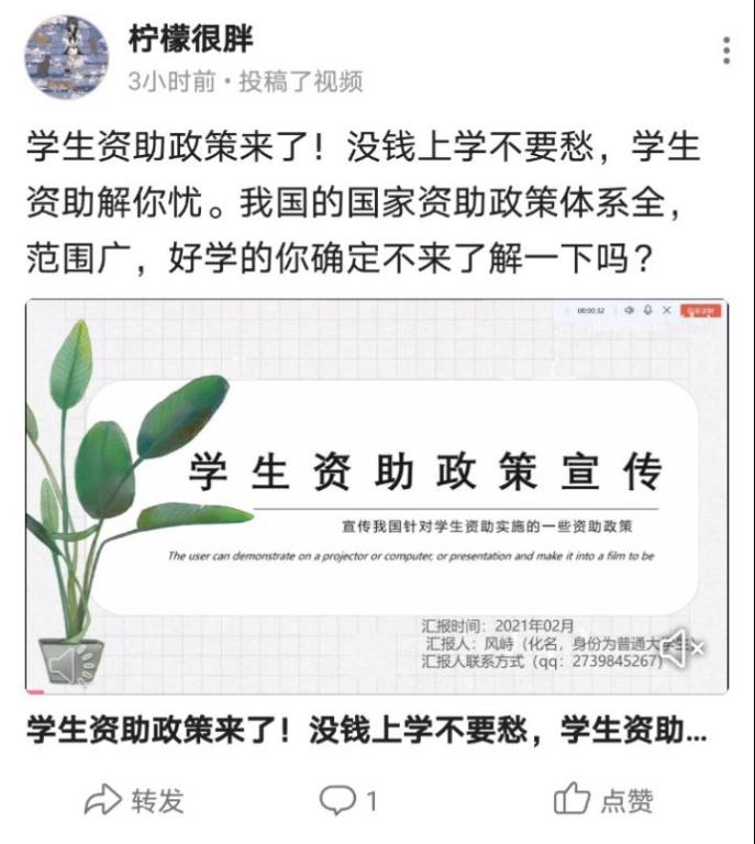 如何将资助政策讲解得不枯燥无味、吸引大家的兴趣?参与活动的同学或精心拍摄制作关于宣传国家资助政策的视频;或选择动画片段,结合国家资助政策内容配音创作;或以国家资助政策为主题制作海报、手抄报或漫画;或在线上开展国家资助政策宣讲,向大家详细介绍国家和学生资助政策体系,他们通过QQ空间、b站、抖音等公众平台对自己的实践成果进行了展示,使学生资助政策宣传更加贴近生活,以呼吁更多的人参与到资助育人工作中来。