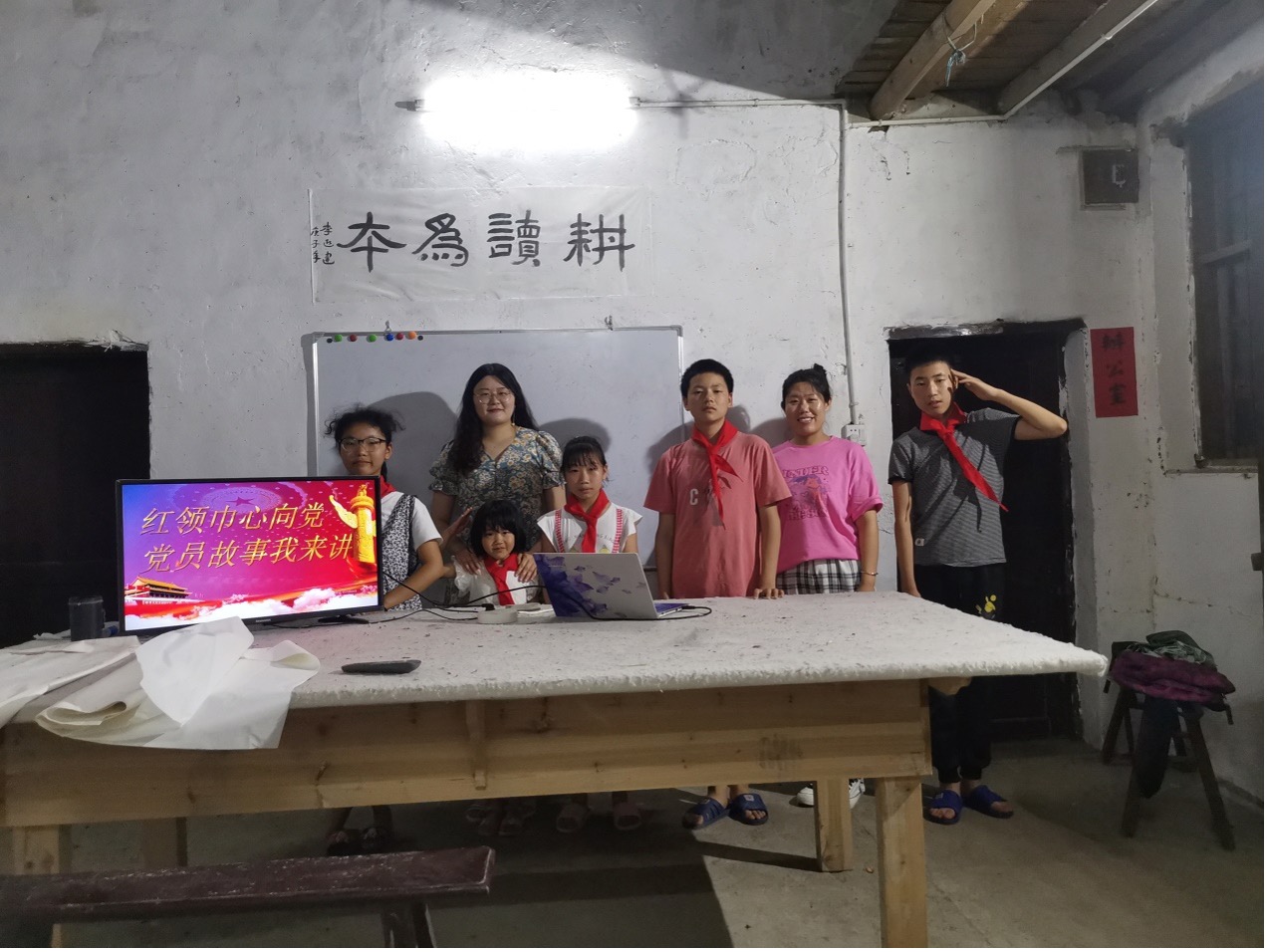 恰逢建党百年,本学期开学以来,支教队便将四史教育融入耕读活动,每周末晚都在“耕读仓”开讲四史教育。队员们通过讲述一个个生动鲜活的四史故事,为学生们打开建党百年的时空之门,让他们感受历史文化之渊博,感知四史文化之脉搏。此外,支教队员还组织学生观看爱国电影、学唱红歌,引导学生重温红色经典,了解中国革命史和中国共产党历史,感受革命情怀。