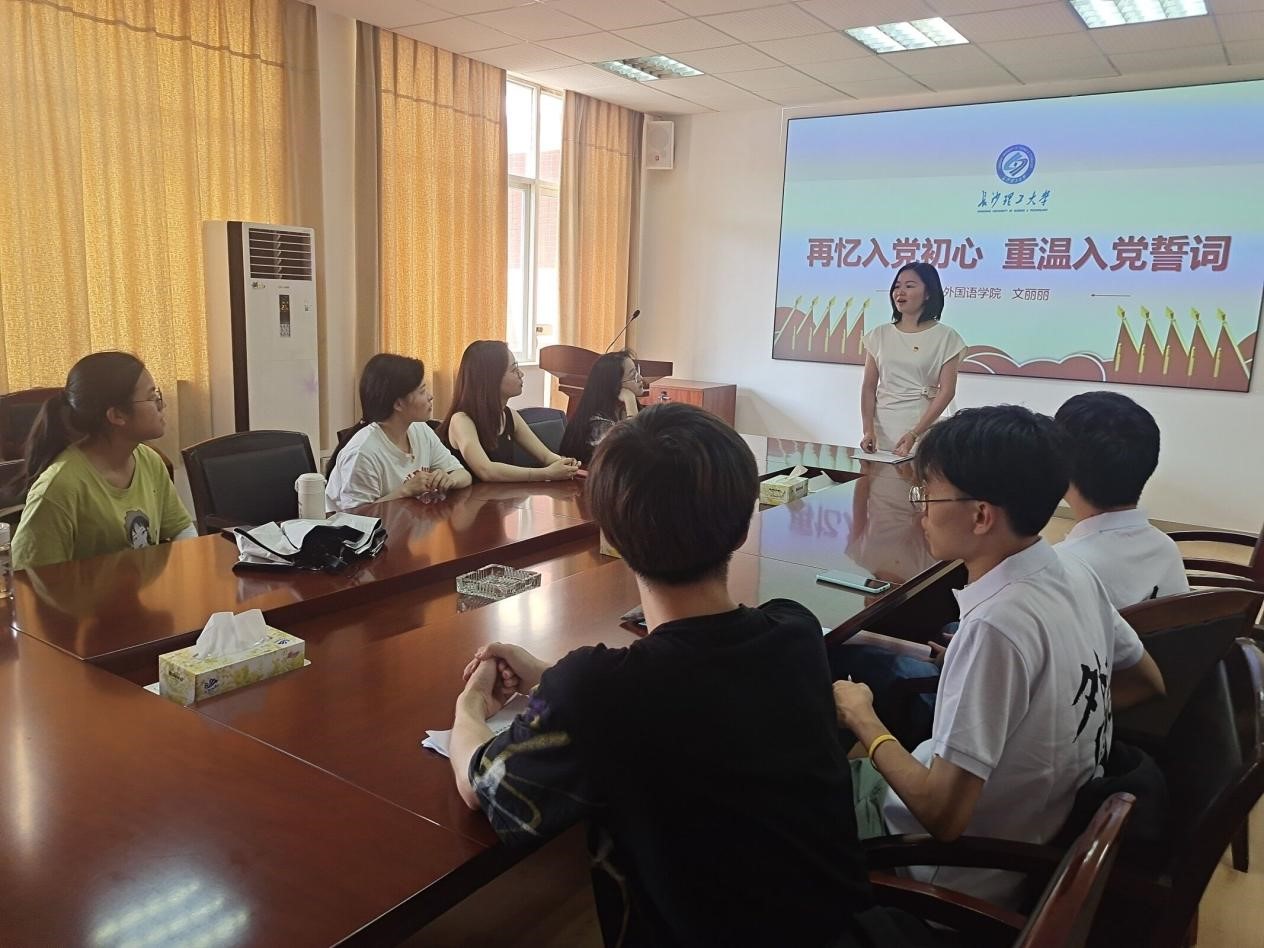 6月24日下午,外国语学院本科生党支部在云塘校区文科楼A区603会议室开展了以“再忆入党初心,重温入党誓词”为主题的党课,主讲人为院党委书记文丽丽,全体毕业生党员参加,党建辅导员袁媛主持。