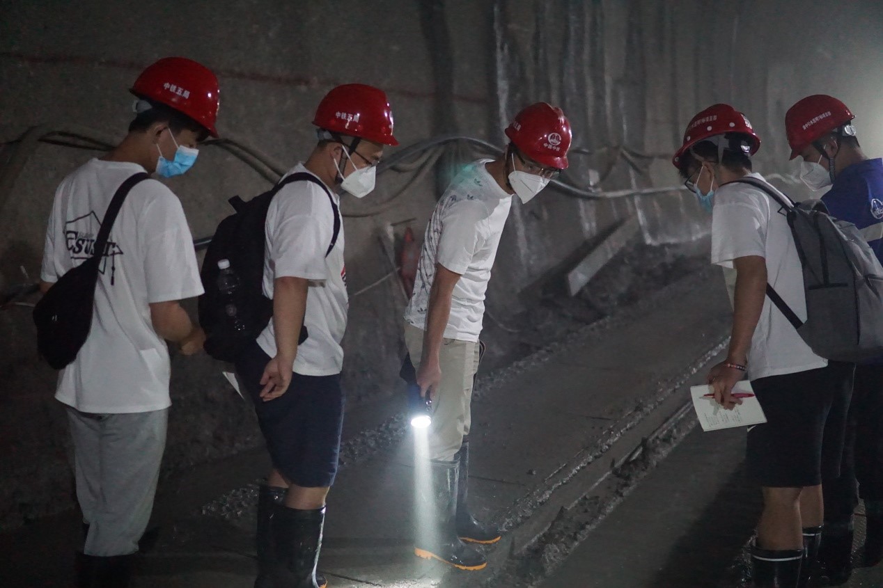 云南滇中引水工程是国务院确定的172项节水供水重大水利工程中的标志性工程,从金沙江取水,途经丽江市、大理州、楚雄州、昆明市、玉溪市,终点为红河州新坡背。由于引水隧洞的建设工程条件复杂,且属于生态敏感区,所以工程对周边环境的保护及恢复标准很高。“百闻不如一见,一见不如实践”,团队抵达中国中铁五局云南省滇中引水工程昆明段施工7标项目部后,每天前往隧洞施工现场,进入隧洞内部拍摄数百余张样品照片、攀爬数千个隧洞台阶,对隧洞提升机拉索抖动问题、隧洞混凝土运输溜槽卡料问题、弃渣场植被破坏问题、隧洞地下水污染问题、隧洞洞口污染源等三十多项研究内容开展实地调研工作。