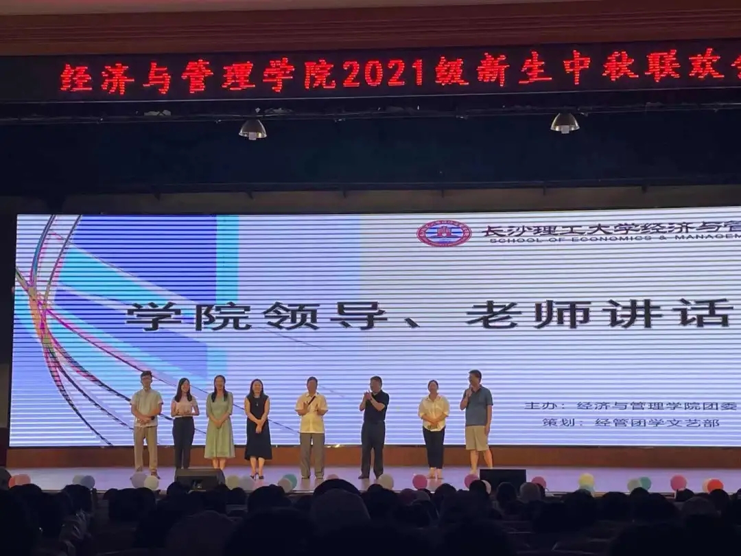 首先,到场的各位领导老师依次向新生们送上了中秋祝福和新生寄语,丁丹书记说:“这个中秋是21级经管学子第一次离家过中秋,大家虽然无法回家与家人团聚,但在经管的大家庭里大家并不会孤单。希望大家在今后的大学生活里,要好好学习,懂得感恩。今晚不要忘记给父母打个电话,报个平安,道一声中秋快乐。”陈均杰老师说:“热烈欢迎大家来到长沙理工大学经管学院,经过军训大家晒黑了,但也强壮了。在中秋佳节来临之际祝大家身体健康,中秋快乐!”唐青副书记说:“这个中秋是21级经管YOUNG来到长理的第一个中秋,祝大家在经管学院变得越来越好!”谢朝华副院长说:“大家要勤于锻炼,多读书多学习,祝大家未来的学习之路一路辉煌!”领导老师们的节日祝福让新生们感受到来了经管学院就像是回到家一样。接着,带训教官们也为同学们送上了真挚的节日祝福。随后,联欢会的节目异彩纷呈,夺人眼球,经管舞队的舞蹈《Loca》率先点燃全场;陈丽君、张勋、张潇尹、张钰茹、姜凌妍、董庆峰带来的歌曲串烧涵盖了说唱、双人对唱、戏曲等各种演唱形式,精彩绝伦,引起观众阵阵欢呼;小品《仙女姐妹》笑点不断。在游戏环节中,21级新生积极踊跃,纷纷上台参与,也让联欢会的气氛达到了一个高潮。在游戏进行的同时,团学会的学生干部们将准备好的迎新小礼物和月饼分发到每一位21级新同学的手中。游戏过后,哈萨克族的凯撒和阿克两位同学演唱了歌曲《红色高跟鞋》,他们不仅用了汉语演唱,中间还用哈萨克语进行了改编;经管礼仪队进行了走秀表演,俊男靓女们的出现再次引起全场欢呼;苏铅楮、邓雅心、袁琳涵、陈尹仪带来了舞蹈串烧,她们用轻盈的舞步展示了青春的模样;最后,经管团学会带来大合唱《星辰大海》,观众席亮起了闪光灯,一闪一闪的灯光就像是星辰,用大声齐唱的歌声圆满结束了本场联欢会。