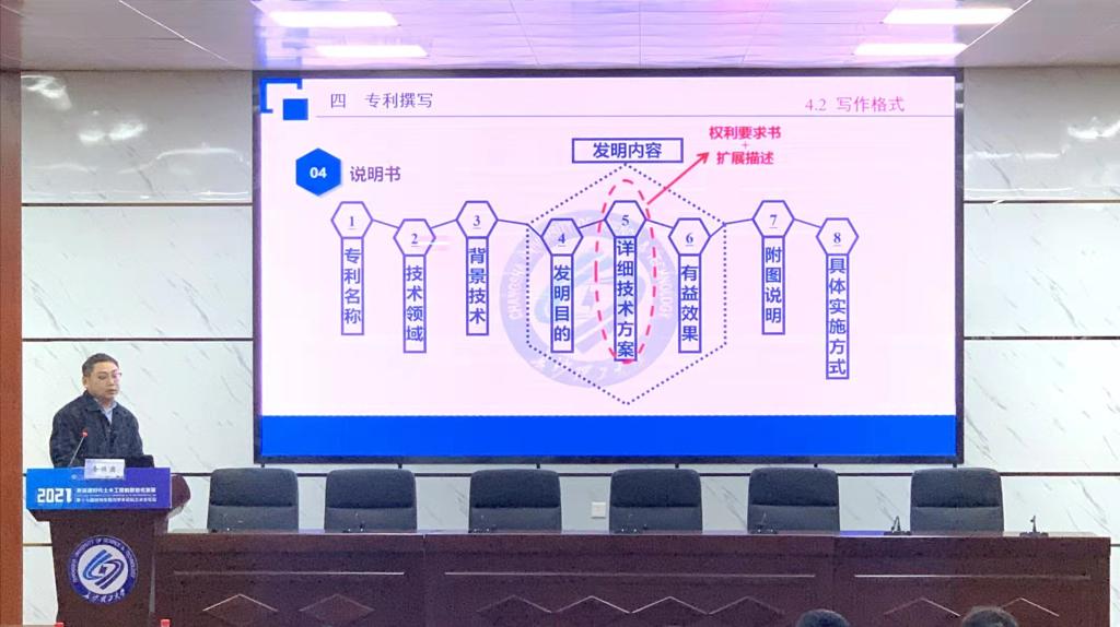 查焕奕以“专利申报:从0到1的突破”为主题,讲解了何为专利,如何构思、撰写和申请专利。并以“用于岩土体内部的高效吸排水管”发明专利为例,详细介绍了专利申请书、摘要及附图、权利要求书、说明书及附图的具体撰写流程和方法。最后,他强调了专利的撰写和发表对于提升科研能力的重要性。