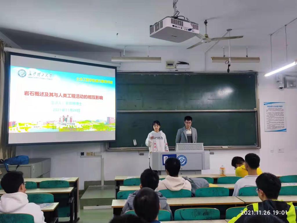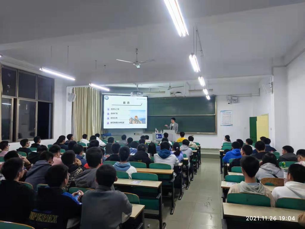 11月26日,土木学院在金盆岭校区举办讲座。朱旭明博士以《岩石概述及其与人类工程活动的相互影响》为题作讲座,学院90余名学生参加。