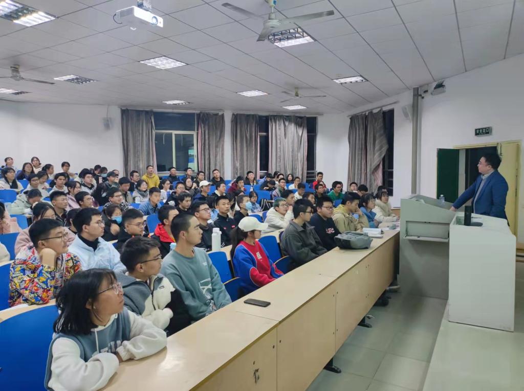 曾铃以“专业与人生”为题,分别从大学规划、专业学习、大学生活、职业发展四个方面与同学们进行分享。他以哈佛大学的调查数据向同学们展示了生涯规划的重要性,并指出大学四年的目标不止是好好学习,更要结识老师、团结同学,“你身边是什么样的人,你才能成为什么样的人。”在专业学习方面,他指出了学习课程、学习方法和等级考试的重要性。在大学生活方面,他从寝室日常、团建活动、恋爱交友和社会实践四个方面为大家翔实地讲述了大学生活应当如何度过。在职业发展方面,他为大家分析了公务员考试、研究生考试和就业城市的选择等领域的社会形势。