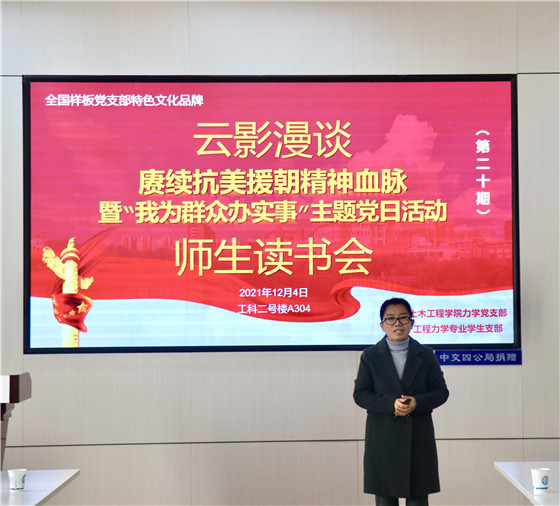 12月4日下午,土木工程学院力学系师生在工科二号楼学生发展中心,以“赓续抗美援朝精神血脉”为主题,开展全国样板党支部特色文化品牌活动之“云影漫谈”师生读书会第20期。学科建设与发展规划处副处长赵冰、学院党委副书记黄阿明、副院长付果,力学系师生党支部成员及50余名力学系学生代表参加了此次读书会。
