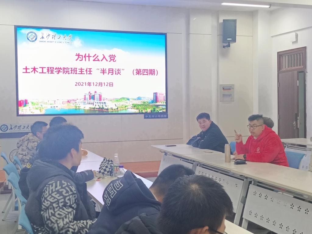 为进一步深化理想信念教育,加强班级思想建设,及时了解、准确掌握新生入学后的思想动态,加强做好大学生思想政治引领的针对性、实效性,12月12日晚,土木学院在院学生发展中心开展班主任“半月谈”(第四期)活动,围绕“为什么入党”主题,聚焦本科新生思想引领。智能建造2103班班主任李小军老师及全体入党积极分子参加活动。