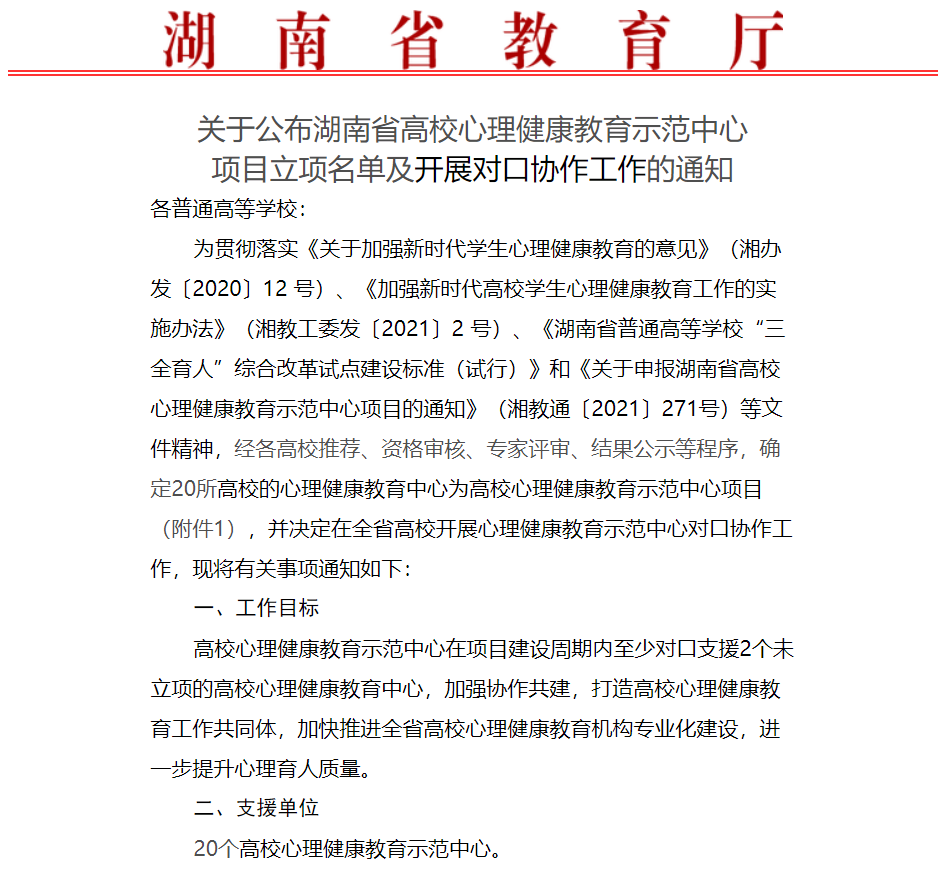 为加快推进全省高校心理健康教育机构专业化建设,进一步提升心理育人质量,湖南省教育厅开展了高校心理健康教育示范中心项目,并决定在全省高校开展心理健康教育示范中心对口协作工作。经各高校推荐、资格审核、专家评审、结果公示等程序,雷竞技官网心理健康教育中心于2021年12月成功立项湖南省高校心理健康教育示范中心。