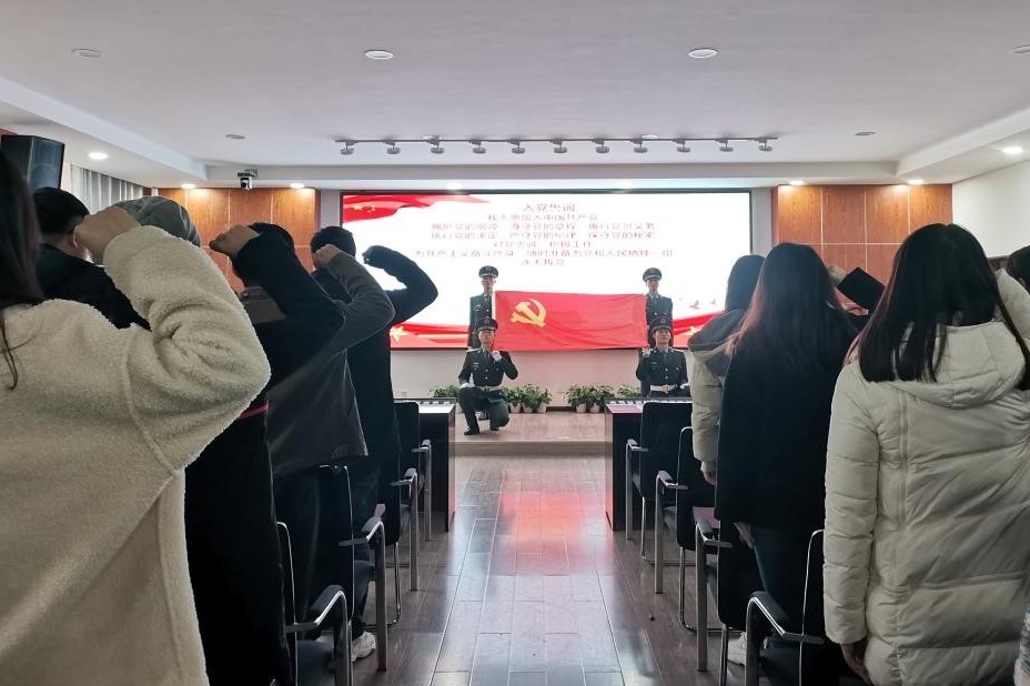 理着装、授党徽、戴党徽,一枚枚崭新的党徽经各支部书记之手佩戴在每一名新发展党员的胸前。在鲜艳的党旗照耀下,所有同志起立,右手握拳,面向党旗,庄严宣誓。“宣誓人:唐梓豪、刘勇、礼贤......”80字的入党誓词字字千钧,一束束坚毅目光灼灼有神,87名宣誓人的接力承诺铿锵有力,在郑重的承诺中将理想、信念、使命坚定传承。