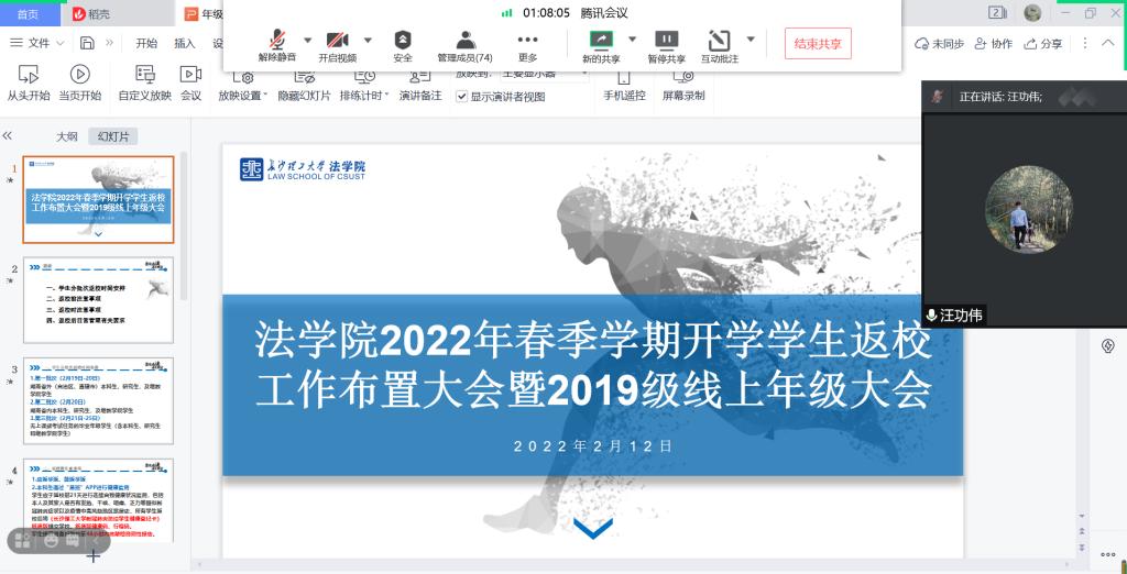 2月12日,法学院利用腾讯会议分时间、分批次召开年级大会,学院党总支副书记汪功伟、各年级辅导员和全体学生参加会议。