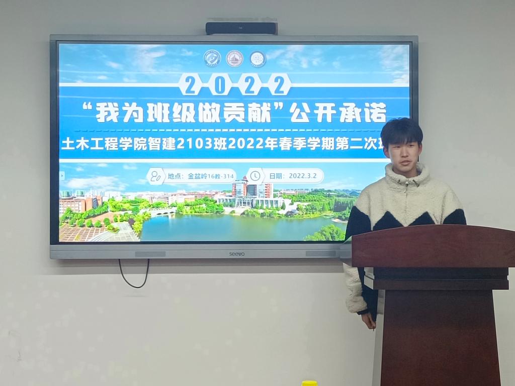 会上,10位代表首先进行了“我的寒假 我的节日”分享交流。回顾分享了他们的寒假生活和春节年俗,从学科竞赛训练营到冬日21天学习打卡,从打工经历到体育锻炼,大家的总体感受是充实而丰富多彩。吴家亮解读了《智建2103班2022年工作计划》,从“思想引领、学风建设、教育养成、素质提升、队伍建设”等方面,向同学们介绍了班级2022年重点工作。之后,全体同学一一上台开展了“我为班级做贡献”公开承诺,进一步明确了新学期的学习目标,从学期计划,英语四、六级、计算机二级、绩点提升、加强锻炼、学科赛事等方面为新学期注入新的动力。