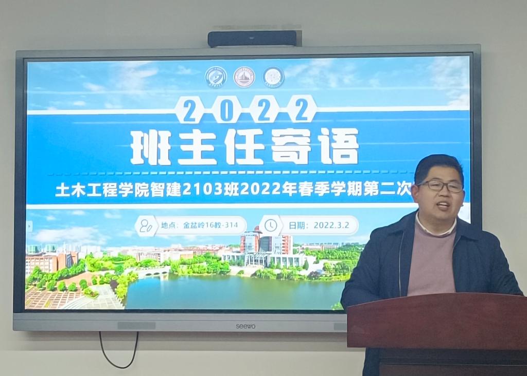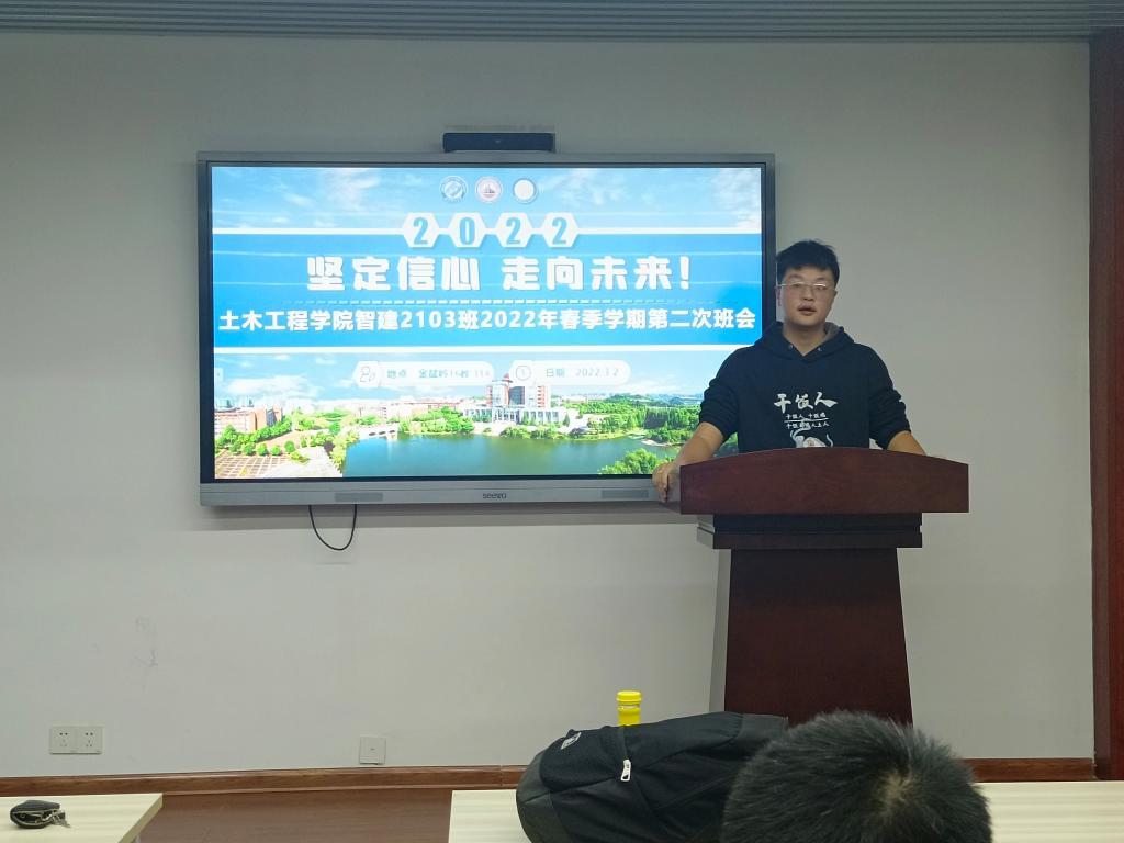 3月2日,土木工程学院智能建造2103班开展主题为“坚定信心,走向未来”的2022年春季学期第二次班会。班主任李小军老师、2021级辅导员邓文杰老师、刘文成老师以及全体同学参加班会,班长吴家亮主持会议。