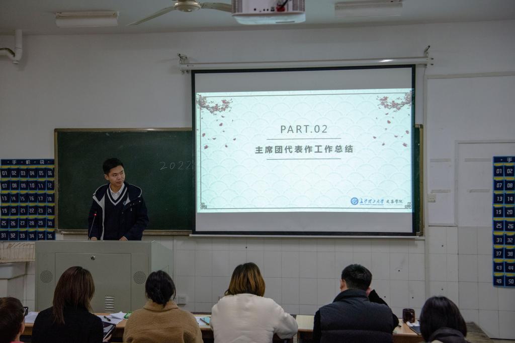 戚靖作开场发言后,学生会部门负责同学从上一学期工作开展情况、存在问题和下一阶段工作安排展开总结和反思;学生会主席团朱伟对团委学生会的工作情况作回顾与总结,并强调学生会成员要保持工作热情,积极开展新的有学院特点的活动。朱伟代表学生会表达做一名合格的学生干部,要增强集体荣誉感,要在工作中积极思考,要保持学生本色,要认真服务同学,要注意自身言行举止。