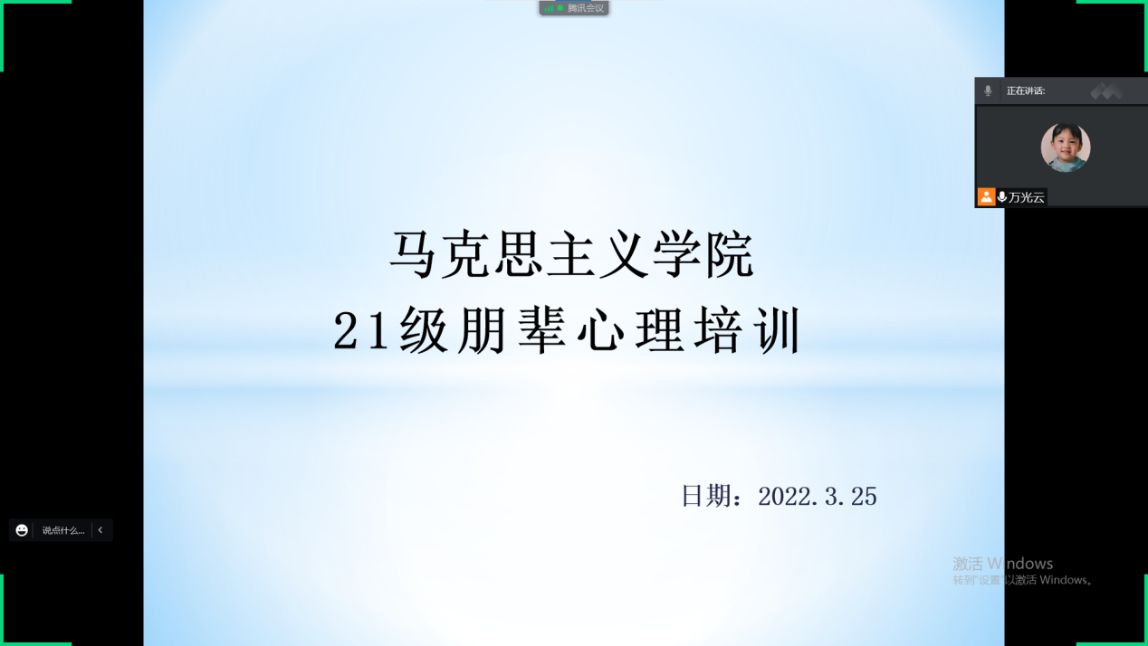 3月25日晚,马克思主义学院21级全体寝室长、专业负责人及各班长参加本次朋辈心理知识培训活动,心理部成员万光云作主讲。出于防疫要求,本次会议方式为线上腾讯会议。