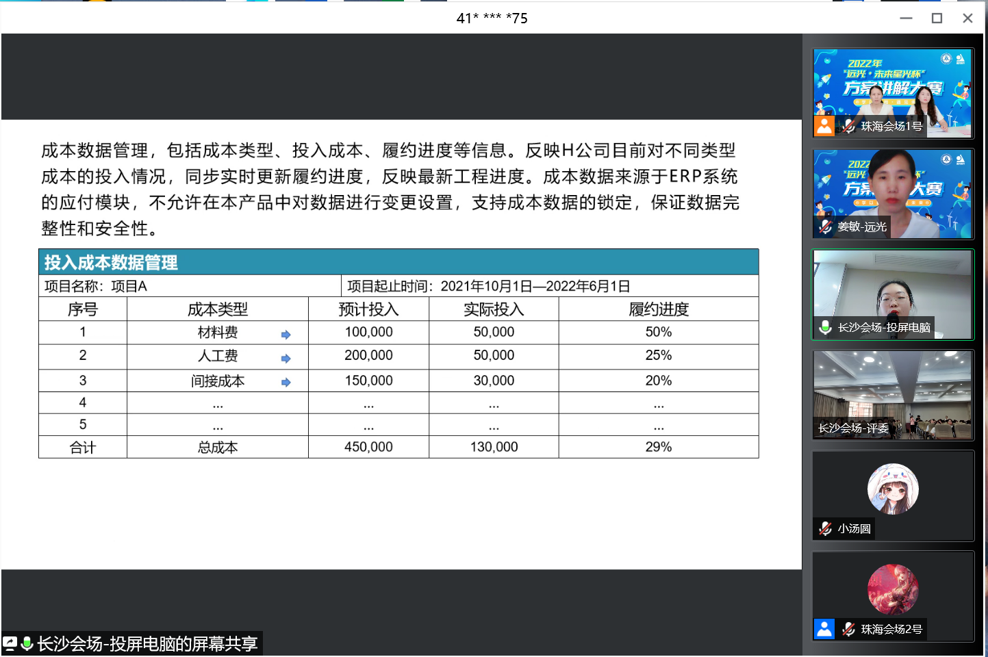 5月24日下午,经济与管理学院“远光·未来星光杯”方案讲解大赛决赛在云塘校区文科楼D207教室举行。此次比赛由经管学院协同远光软件股份有限公司共同举办,比赛采用线上、线下相结合的方式进行。远光软件股份有限公司副总裁何永刚、经管学院党委书记丁丹出席本次比赛。远光软件股份有限公司业务专家陈红霞、姜敏、李谦谦,经管学院教师袁江云、扶缚龙、曾小青担任评委,共10支队伍参加比赛。张可涵担任主持人。