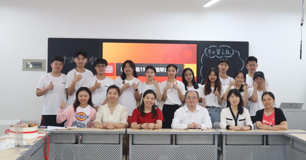 毕业班会上,师生们共忆三年大学时光,当一幕幕共同学习、生活的场景再次展现,在场师生不禁被浓浓的师生情、同学情感动落泪。同学们既对5名同学顺利出国表示祝贺,也难掩不舍,纷纷讲述自己在中法班的求学经历和未来目标,表达对学院和老师们的感谢,互道祝愿。随后,每位老师都送上了对5名毕业生的毕业祝福。副院长彭新宇寄语同学们要立大志向、成大气量、建大胸怀、树大格局,将个人学业与祖国命运联系一起。副书记唐青希望同学们树立“四个自信”,出国的同学要成为中华优秀传统文化的承继者和宣传者。副院长刘坚祝福同学们学业有成,班主任杨密和同学们共同回忆了三年的美好时光。丁丹书记激励同学们要注重个人修养的养成,要打好专业基础,练就过硬本领,要努力成为中华民族伟大复兴梦的建设者。学院还特别准备了刻有“中法一九,长长久久”的蛋糕,班会在齐祝福、共许愿、分享蛋糕的欢乐氛围中结束。