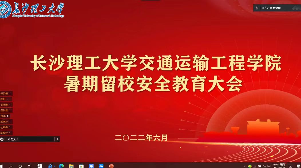 6月30日上午,交通学院举行暑假留校安全教育线上会议,交通学院党委副书记涂道勇、研究生辅导员彭怡峰以及全体暑期留校研究生参加了此次会议。