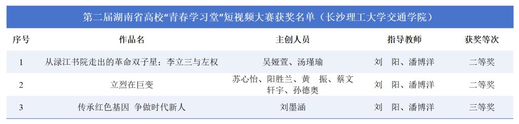 本次大赛由中共湖南省委教育工委、湖南省教育厅、湖南日报社举办,以短视频为载体、思政教育为核心,吸引了全省110所高校的2200余件作品参赛。经网络展示、专家评审等环节,交通学院报送的作品从众多优秀作品中脱颖而出。其中,《从渌江书院走出的革命双子星:李立三与左权》和《立烈在巨变》斩获二等奖,《传承红色基因 争做时代新人》荣获三等奖。获奖作品紧扣“场馆里的思政课”“讲好身边故事”等主题,通过青年视角诠释红色文化、乡村振兴等时代命题,以新颖的视听语言让思政教育“活”起来、“潮”起来。