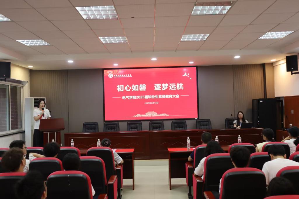 为强化毕业生党员教育,激励青年学子勇担时代使命,6月10日晚,电气学院在工一B503报告厅举行2025届毕业生党员教育大会。学院党委书记丁丹、党委副书记周巍、学生党建辅导员熊文娟及全体毕业生党员参加活动,会议由张娅主持。