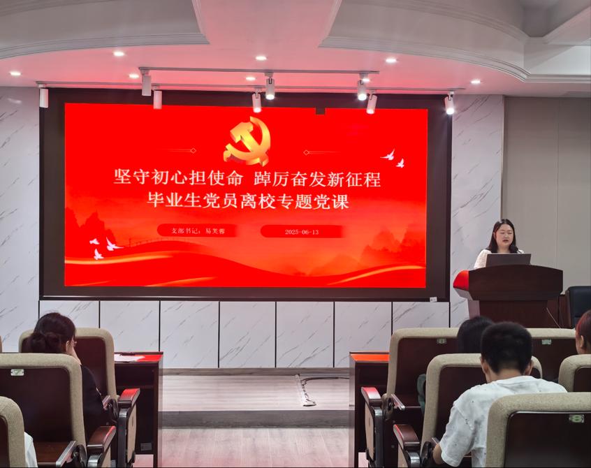活动开篇,全体党员集中观看党员教育片《党在新时代的徙木立信之举》,该片以新时代党的公信力建设为核心,生动诠释“立信于行”的实践逻辑。支部书记易芙蓉、唐宏敏围绕“毕业生离校前党性教育”讲授专题党课,结合毕业季特点,党课聚焦“责任传承”与“服务延续”,既有理论深度,又贴合毕业实际,为在场的学生党员注入“离岗不离责、离校不离心”的精神动力。各支部支委代表围绕支委换届分享经验,内容聚焦候选人选拔机制、换届流程规范、新老班子责任交接等实操话题。