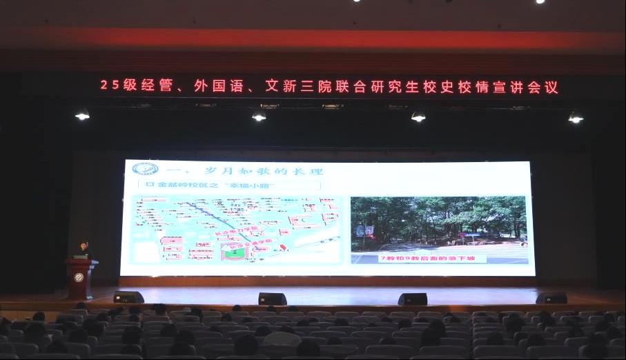 11月4日晚,经济与管理学院联合文学与新闻传播学院、外国语学院在金盆岭校区5号教学楼开展了2025级研究生新生入学教育系列活动——校史校情主题教育宣讲会,会议由长沙理工大学研究生宣讲团焦楚楚主讲。