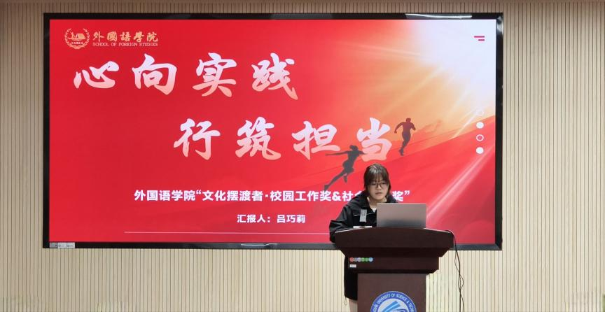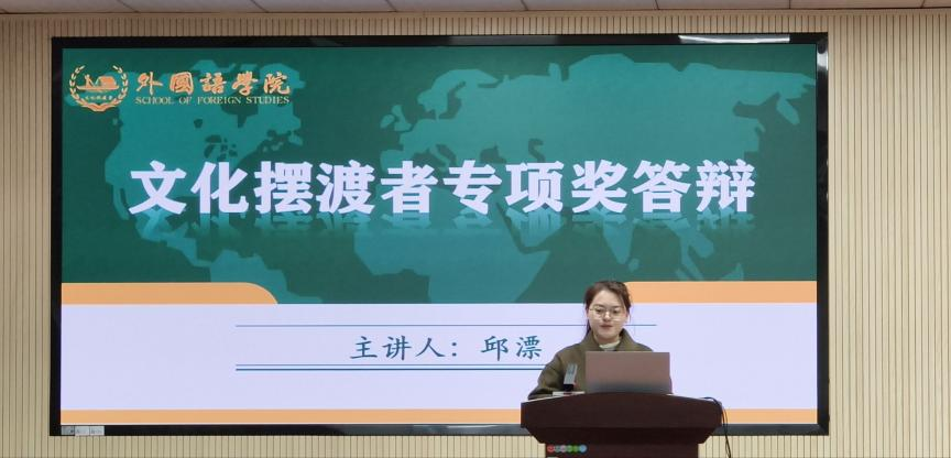 为表彰在专业学习、校园服务与社会实践中表现优异的学子,培养具有国际视野、精通外语、致力于中华文化传播的优秀人才,11月19日晚,外国语学院“文化摆渡”专项奖答辩会在金盆岭校区3号教学楼321报告厅举行。学院党委副书记周芳、副院长姚尧,党委委员张志武、陈菁,英语系主任唐瑛、学工办主任武巧琳、团委书记郭恒、本科生辅导员毛婕担任评委,近200名学生到现场进行观摩。