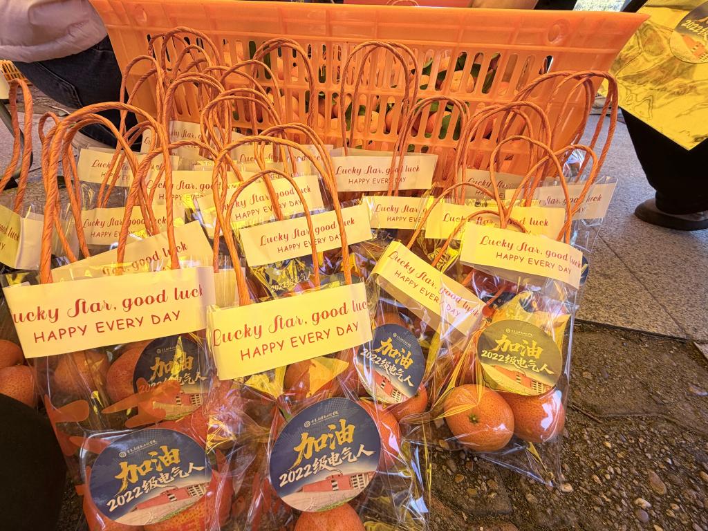 砂糖橘装入印有“大吉大利”的橙色礼品袋,并贴有学院专属标识,红蓝相映的图案与“加油,2022级电气人”的字样,传递出学院作为学子坚强后盾的温暖心意。