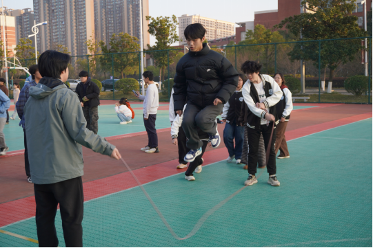 本次运动会以“团结协作”为核心,设置了“趣味运气球”“纸塔争霸”“两人三足”和“跳长绳”四项特色项目,每项均要求男女混合组队,确保全员参与。在“趣味运气球”中,队员们默契协作,小心翼翼运送气球;“纸塔争霸”环节则展现了同学们的巧思与耐心,简易材料搭建起造型各异的稳定纸塔;“两人三足”比赛口号整齐,步伐一致,即便摔倒也迅速调整、彼此扶持;“跳长绳”作为压轴项目,将现场气氛推向高潮,队员们鱼贯而入,默契跳跃,充分彰显了集体协作精神。