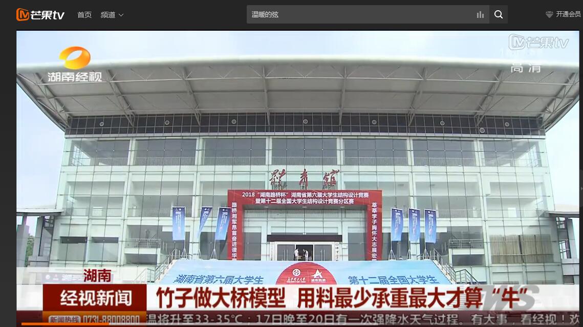 湖南经视5月13日经视新闻对5月11—13日在雷竞技官网举行的“湖南路桥杯”第六届湖南省大学生结构设计竞赛暨第十二届全国大学生结构设计分赛区竞赛进行了报道。