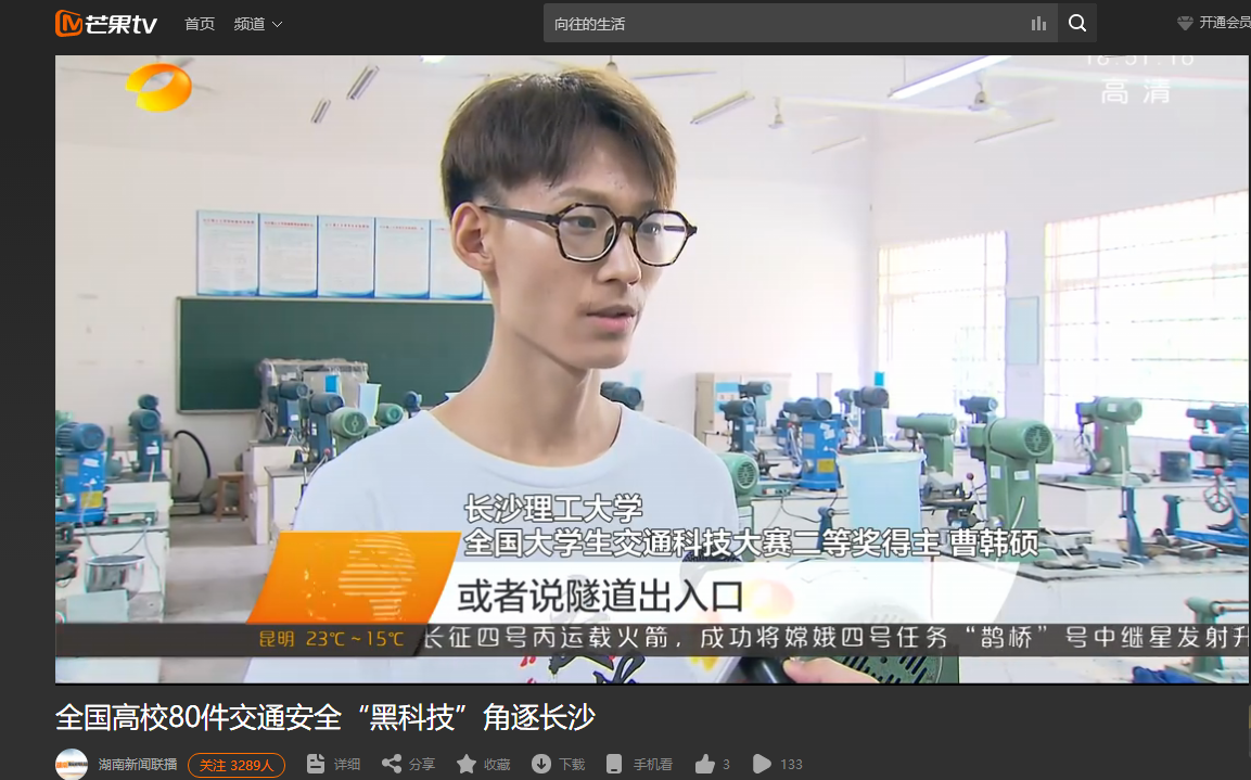 湖南卫视5月21日新闻联播对雷竞技官网举办的第十三届全国大学生交通科技大赛赛事进行了报道,初赛阶段共收到来自清华大学、东南大学、西南交通大学等124所高校的380件作品,报名人数和项目数均创历史新高。经国内外80余名专家严格评审,来自同济大学、华南理工大学等47所高校的80件作品入围决赛,其中包括我省中南大学、长沙理工大学、中南林业科技大学3所高校的8件作品。