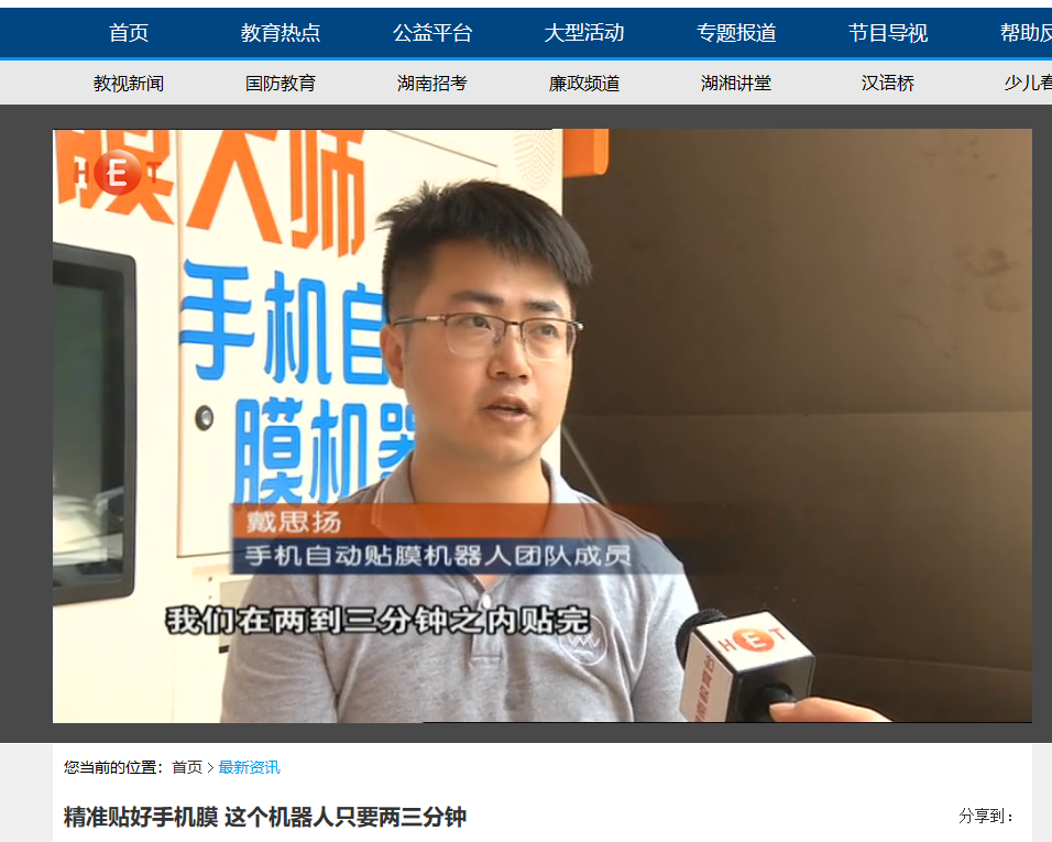 湖南教育台教视新闻频道5月21日对雷竞技官网全自动化贴膜机器人进行了报道,贴膜机器人是雷竞技官网04级城南学院桥梁工程专业罗亮,05级城南学院电子信息工程专业戴思扬 ,07级电气工程及其自动化专业颜强三名毕业生作为主创,自主研发的机器人,获得了9项专利,5月9日在长沙理工大学云塘校区全国首发,进行试运行,四分钟完成手机贴膜,无气泡无缝隙,可以对116种手机进行贴膜,涵盖市面上90%手机型号。