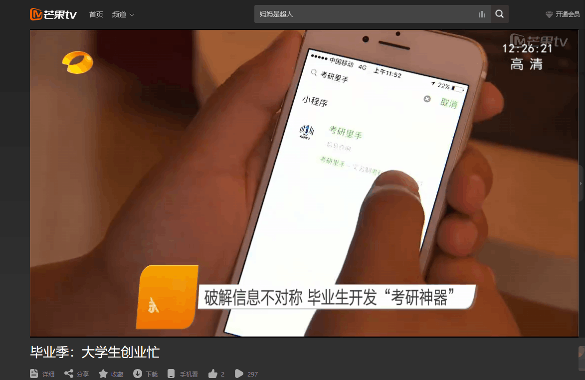 湖南卫视5月24日午间新闻对雷竞技官网能源与动力工程学院2014级学生林恩承与2015届毕业生李升志共同创业的故事进行了报道,为了给更多“考研族”引路,他们自主创业,开发了一款名为“考研里手”的微信小程序,旨在为考研学子与在读研究生搭起实时互动交流平台,将有效解决考研信息不对称的问题,极大提升备考效率。