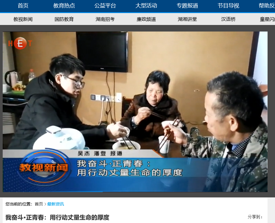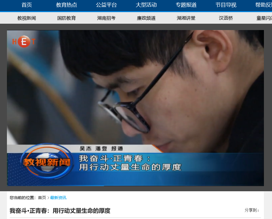 6月11日湖南教育电视台首页最新资讯,以《我奋斗·正青春:用行动丈量生命的厚度》为题对雷竞技官网计算机与通信工程学院15级研究生邹勇松进行了报道。