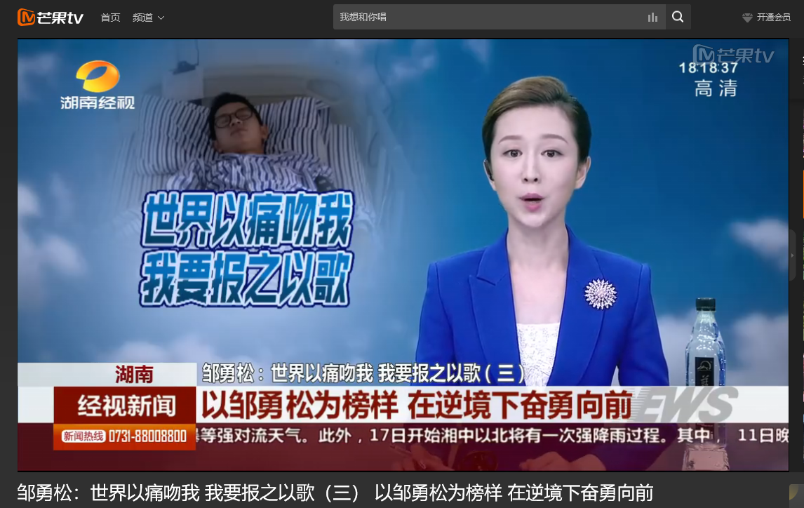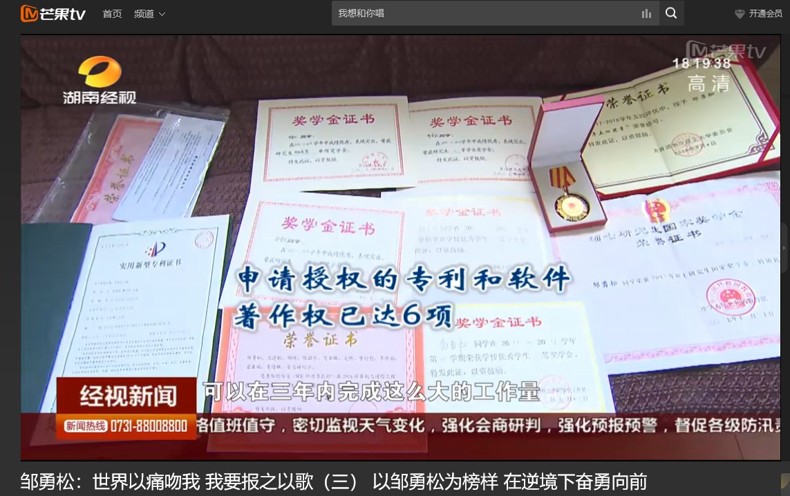 湖南经视 6月11日经视新闻,以《邹勇松:世界以痛吻我 我要报之以歌(三) 以邹勇松为榜样 在逆境下奋勇向前》为题对雷竞技官网计算机与通信工程学院15级研究生邹勇松进行了报道。