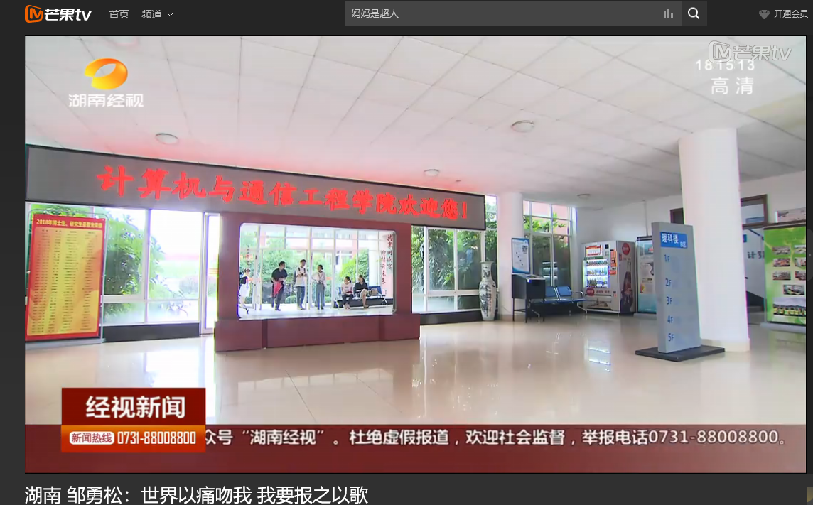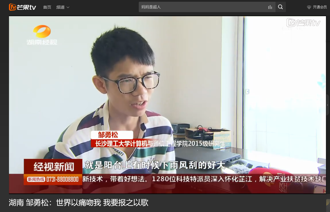 湖南经视6月9日经视新闻,以《邹勇松:世界以痛吻我 我要报之以歌》为题对雷竞技官网计算机与通信工程学院15级研究生邹勇松进行了报道。