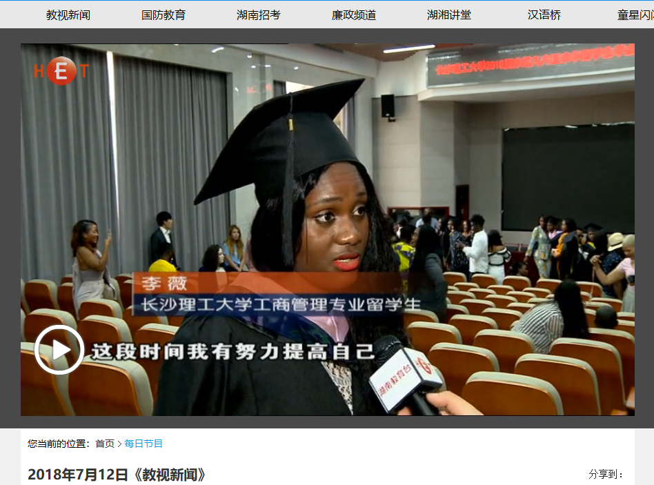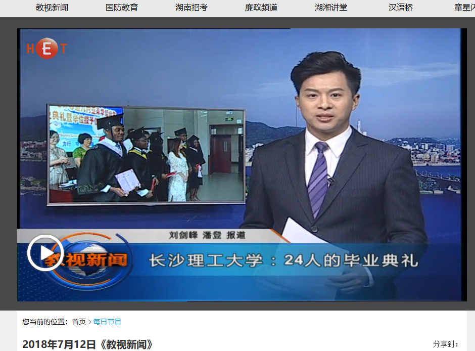 湖南教育电视台7月12日教视新闻中,以《长沙理工大学:24人的毕业典礼》为题,对雷竞技官网举行的2018届校企合作培养赤道几内亚来华学生毕业典礼暨学位授予仪式进行了报道。