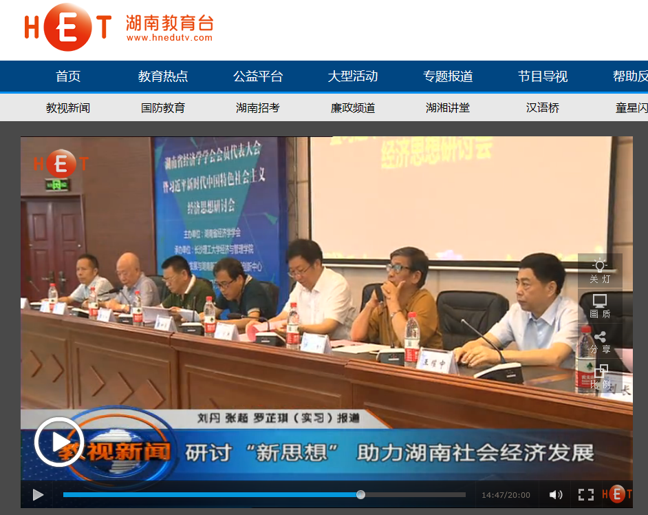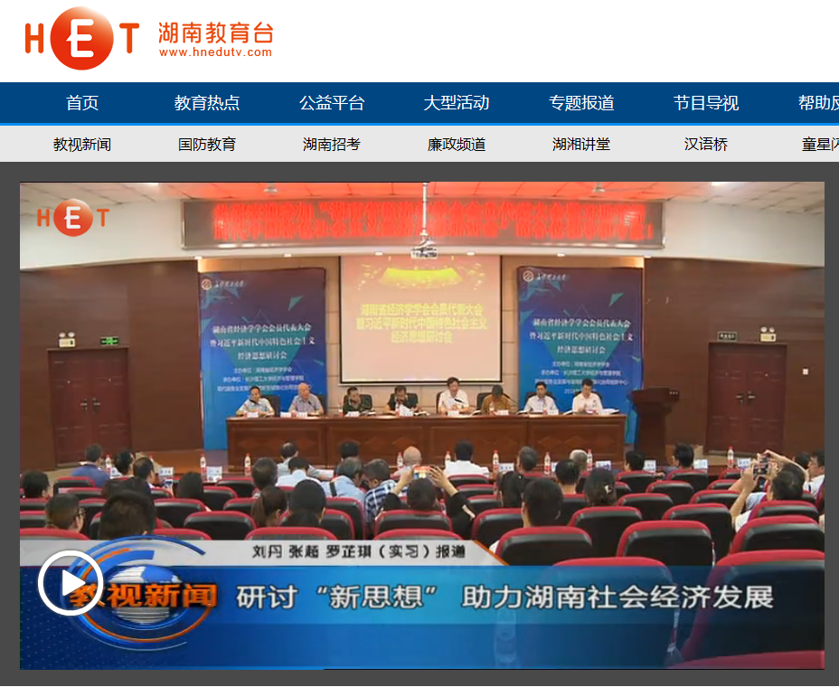 湖南教育电视台7月16日教视新闻14分27秒处,以《研讨“新思想”助力湖南社会经济发展》为题,对在雷竞技官网召开的湖南省经济学学会会员代表大会暨习近平新时代中国特色社会主义经济思想研讨会进行了报道。