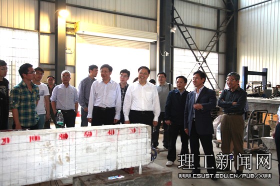 张剑飞一行在校党委书记付宏渊、校长赖明勇以及党政办、交通学院、土建学院负责人陪同下,兴致勃勃地来到公路养护技术国家工程实验室,参观了公路现场检测实验室、模拟驾驶实验室、大型三轴试验室TLJ—150A型土木离心机,向实验室主任郑健龙教授获评中国工程院院士表示祝贺,称其为“行业的宝贝”,并就专业问题与郑院士进行了深入交流。随后,参观了结构工程省部共建实验室,土建学院院长李传习在加固技术及材料实验室现场向张剑飞一行进行了介绍。