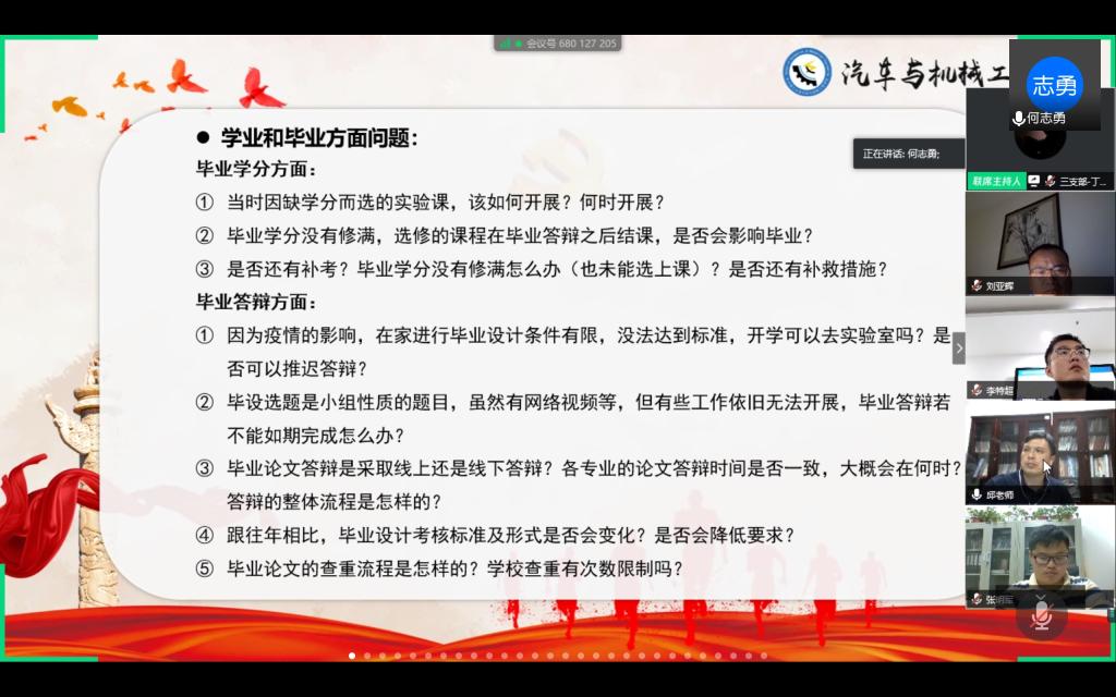 5月11日晚,汽机学院教工与学生党支部通过腾讯会议举行以“助力青年成长成才”为主题的师生党支部“云端”共建交流会。院党委书记邱国良、院长杜荣华、副书记刘亚辉、副院长毛聪、何志勇,各教工支部书记张明军、易继军、张鹏、肖新华、伍文广、学工办辅导员李特超、陶蓝和全体毕业生党员等参加本次交流会。党建辅导员王丽丽主持。