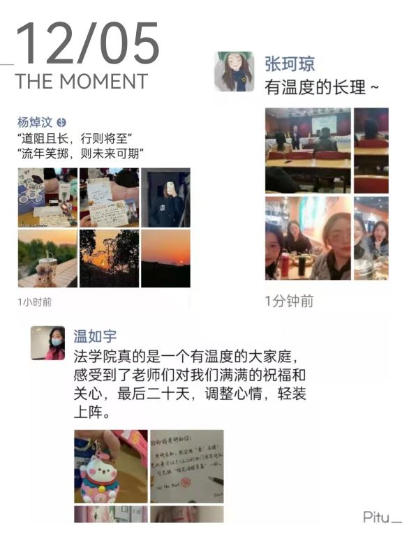 在考研冲刺最后一个月的关键时期,这波独具匠心的实力宠爱,让尽管已经提前得到预报的同学们仍惊喜不已,纷纷把礼物晒到朋友圈,有同学表示:“法学院真的是一个有温度的大家庭。”也有同学将自己收到的祝福分享给其他更多的考研人,“道阻且长,行则将至,流年笑掷,未来可期!”