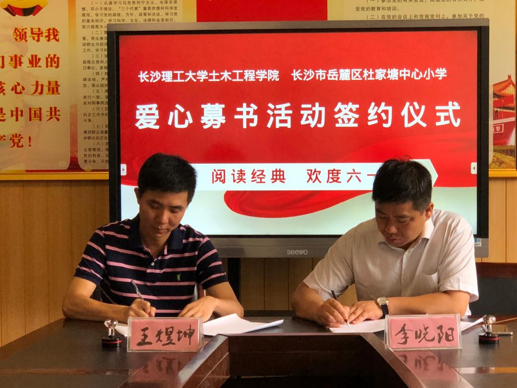 时值第69个六一国际儿童节,一场别样的签约仪式在杜家塘小学的会议室进行。土木工程学院党委副书记王煜坤与杜家塘小学校长李晓阳共同签署了爱心募书合作协议,携手为怀化边远地区儿童送上一份颇有意义的节日礼物。