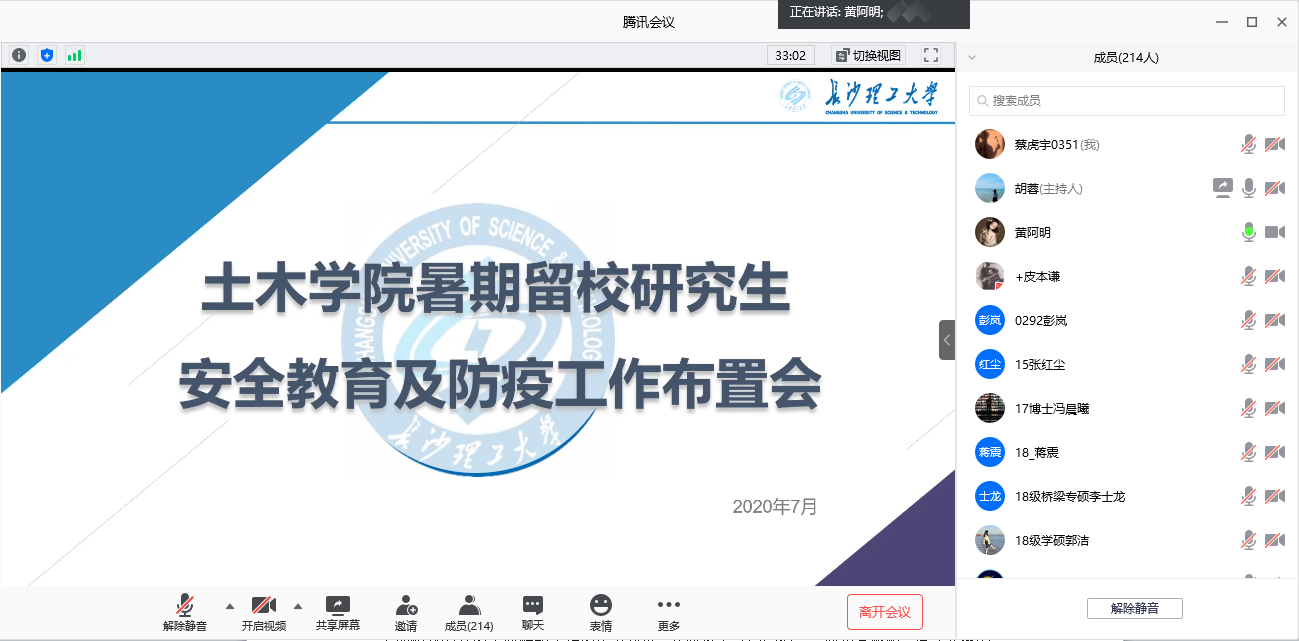 7月3上午,土木工程学院暑期留校研究生安全教育及防疫工作布置会在腾讯会议平台线上召开,学院党委副书记(代理)黄阿明出席会议,240名暑假留校研究生参加本次会议,会议由研究生辅导员胡蓉主持。