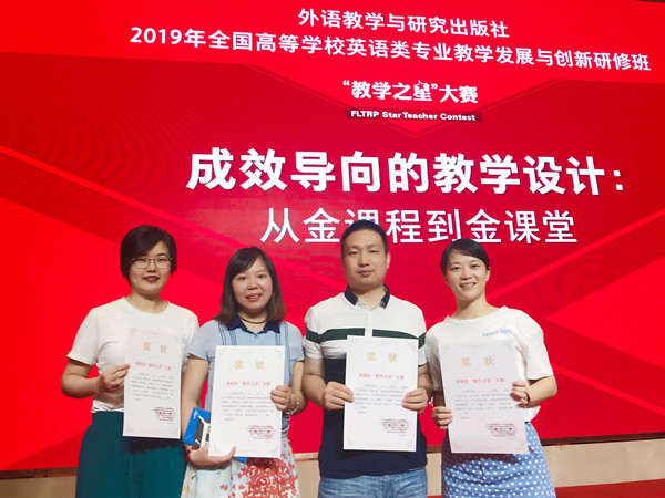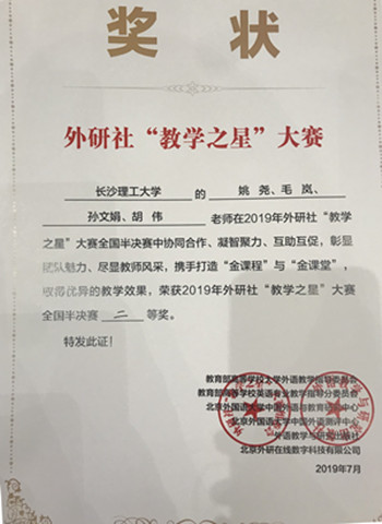 8月1—2日,外语教学与研究出版社2019年“教学之星”大赛全国半决赛在武汉举办,全国高校近700位英语类专业教师齐聚一堂,或参赛、或观摩、或研讨。雷竞技官网外国语学院外国语言文学系姚尧、毛岚、孙文娟、胡伟组成的团队作为湖南省唯一代表队,参加角逐,努力拼搏,荣获全国半决赛二等奖。