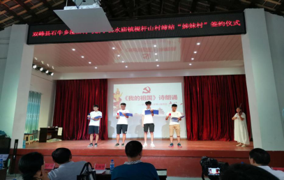 7日晚,博士团在第二次座谈会上就助力枧杆山村文化建设提供了扩建农家书屋、文体活动场所;发挥乡贤作用,推行贤人治村;坚持党建引领,建设孝爱文化的可行性建议。8日上午,双峰县湴田村与新宁县枧杆山村缔结“姊妹村”签约仪式在枧杆山村文化活动中心隆重举行。在签约仪式后的文艺演出中,来自两村的艺术表演者及博士团给村民们带来了独唱、武术、舞蹈等形式丰富的饕餮盛宴。博士团成员在队长刘鑫的带领下,给村民们带来了《我的祖国》诗歌朗诵表演,成员们声音洪亮、抑扬顿挫,在一声声激情澎湃的高歌中表达对祖国母亲深深的热爱和美好祝福,将现场的气氛推向高潮。