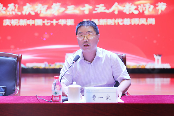 曹一家宣读了表彰文件,通报了省部级及以上人才工程入选者、2018年综合考评优秀单位、2018-2019学年师德标兵和优秀教师以及优秀教育工作者、2019年度教学贡献奖、第四届“十佳辅导员”等获奖名单,希望受到表彰奖励的先进集体和个人珍惜荣誉,再接再厉,继续发挥好模范带头作用,希望全校教职员工立足本职、学习先进、赶超先进、努力工作,为推进学校“双一流”建设,跻身全国“百强”做出新的更大贡献。