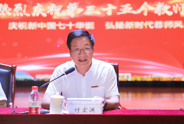 付宏渊指出,学校建设“双一流”、跻身全国百强的底气与自信,源于新时代党和国家对高等教育的重视,源于学校60多年来的办学成就与文化,源于学校拥有一支师德高尚、业务精湛、开拓创新的教师队伍。他认为,要弘扬新时代尊师风尚,就要尊重教师主体地位,营造尊师重教浓厚氛围;要努力改善教学科研环境,激发教师从教热情;要持续加强师资队伍建设,提高教书育人水平。他希望,全校教职工不忘育人初心,严守师德底线,勇于改革创新,始终坚定百强大学目标信心,致力于内涵发展,全面提高人才培养质量,以优异的成绩向新中国成立70周年献礼。