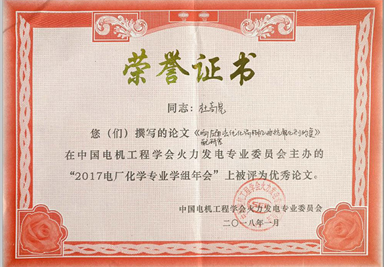 《电厂化学2017学术年会》录用60篇,出版论文集1部,长沙理工大学有4篇论文被评选为大会优秀论文,即《响应面法优化涡轮机油抗氧化剂的复配研究》(作者:杜高宽)(指导教师:汪红梅副教授);《阴树脂粉末对换流站铝合金的腐蚀影响》(作者:杨磊)、《复合胺(ETA+DDA)工况对树脂循环污染的影响研究》(作者:张俞)、《脱销过程中尿素水解产物对水冷壁管的腐蚀研究》(作者:田龙标)。