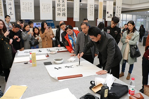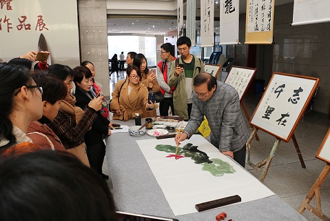 在书画作品开展仪式上,郑章飞讲话并宣布书画展开幕。现场书画笔会同步拉开序幕。在作品展示大厅里,来自各个图书馆代表们和现场读者观众流连书画作品之间,对展出作品赞赏不已;获奖者挥毫泼墨,弄笔丹青,在古典音乐声中,现场沉浸在展示书画艺术的氛围中。