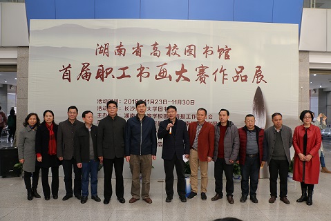 11月23日上午,由湖南省高校图书情报工作委员会主办,湖南师范大学图书馆和雷竞技官网图书馆联合承办,湖南省高校图书馆首届职工书画大赛颁奖典礼及书画作品会展在云塘馆B-102会议室举行。副校长叶泽,湖南大学图书馆馆长兼湖南省图工委秘书长郑章飞、湖南师范大学图书馆馆长周玉波等图书馆领导、湖南维度公司总经理黄开兴、湖南世纪超星有限公司总经理姜波、湖南一帆图书有限公司总经理罗令坤等嘉宾,以及来自省内高校图书馆同仁近100人出席了本次活动。此次大赛共有来自省内13所高校图书馆36位职工的56幅作品参加了书画作品大赛。