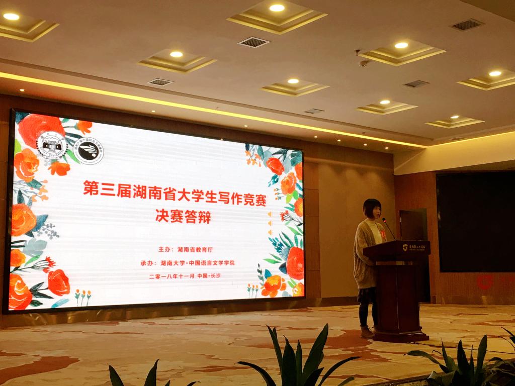 “湖南省大学生写作竞赛”是由湖南省教育厅主办、面向全省普通高校中国语言文学类专业在校大学生的专业学科竞赛,具有规格高、专业性强、学科属性突出等特点,是中文专业唯一省级学科竞赛。大赛以培育人文精神、传承文学经典、提升专业能力、强化专业教学效果为竞赛目的,选择某一古今中外文学经典、文学现象为对象,撰写文学评论文章和回答相关问题。 本届竞赛由湖南大学承办,全省31个参赛单位推荐的155名选手参加了复赛。复赛笔试题为阅读契诃夫的短篇小说《苦恼》,写一篇不少于1500字的评论文章。成绩前18名参加答辩,决出一等奖12名。